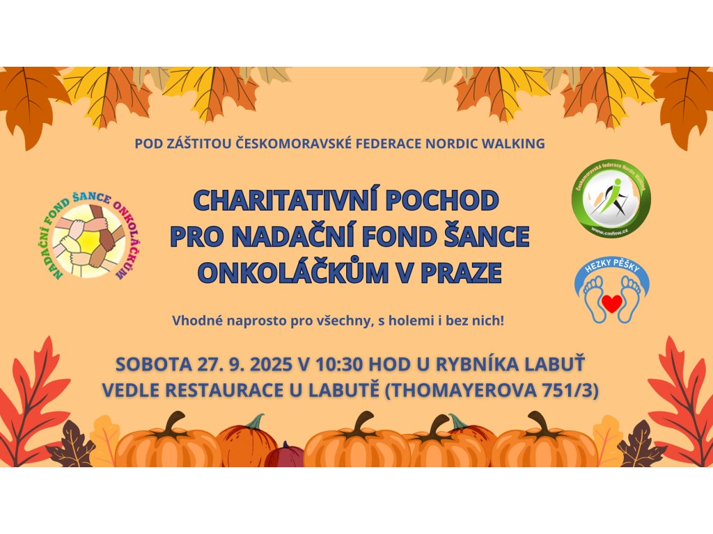 A právě takový pochod pořádáme v Praze my! Celá vybraná částka půjde na transparentní účet  Českomoravské federace Nordic walking, která následně veškeré vybrané příspěvky z lokálních pochodů převede Nadačnímu fondu Šance onkoláčkům