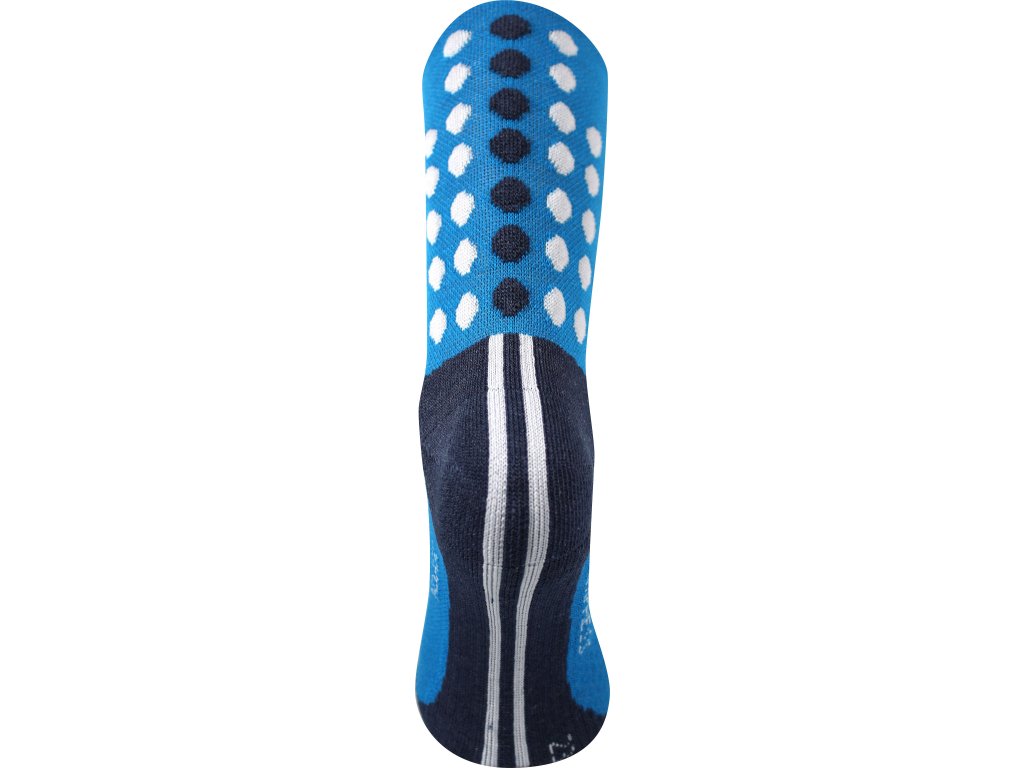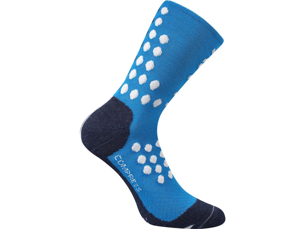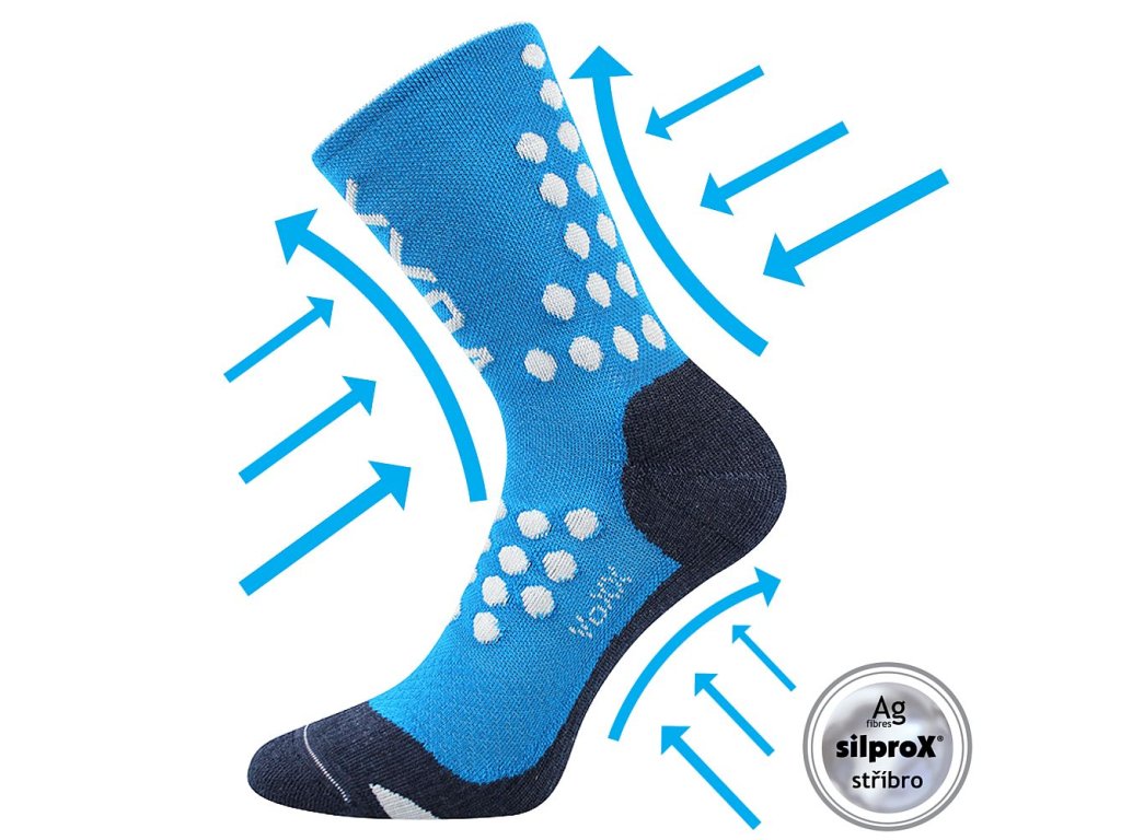 Unisex (dámské i pánské) sportovní ponožky s vyvzorovanou patou a řetízkovanou špicí, speciální konstrukce zamezuje přetáčení v botě, anatomicky tvarované polstrované zóny brání vzniku otlaků a puchýřů, kompresní, napomáhají pevnějšímu držení a vyšší stabilitě kotníku, zapletením materiálu silproX® s ionty stříbra zajišťuje antibakteriální ochrana a jemné polstrování materiálem DRYTEX zajistí maximální komfort a odvod potu při vysoké sportovní zátěži, teplotní třída: A (+10°C až +35°C), kompresní třída 1